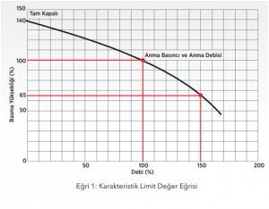 Maksimum Yük: Yangın pompası eğrisi, anma debisinin %150 kapasite değerini sağlamalıdır ve %150 debi kapasitesindeki basınç değeri, anma basıncının %65’in den az olamaz. “Eğri 1” de eğri limit değerleri gözükmektedir.